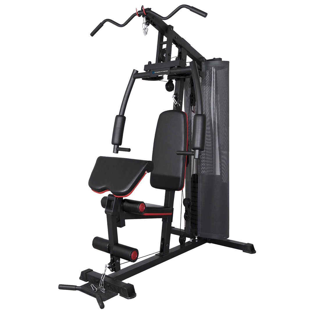 Stark Fitness Home Single Station (SF-H600) is a traditional press bar and bio mechanically designed for maximum chest concentration and outstanding muscle development. Lat pulldown station allows full range of motion through unilateral, bilateral converging, or diverging movement. Leg developer station features the smooth glide bearing system w/ bio mechanically accurate pivot point. Easy to use space-saving no cable change design.